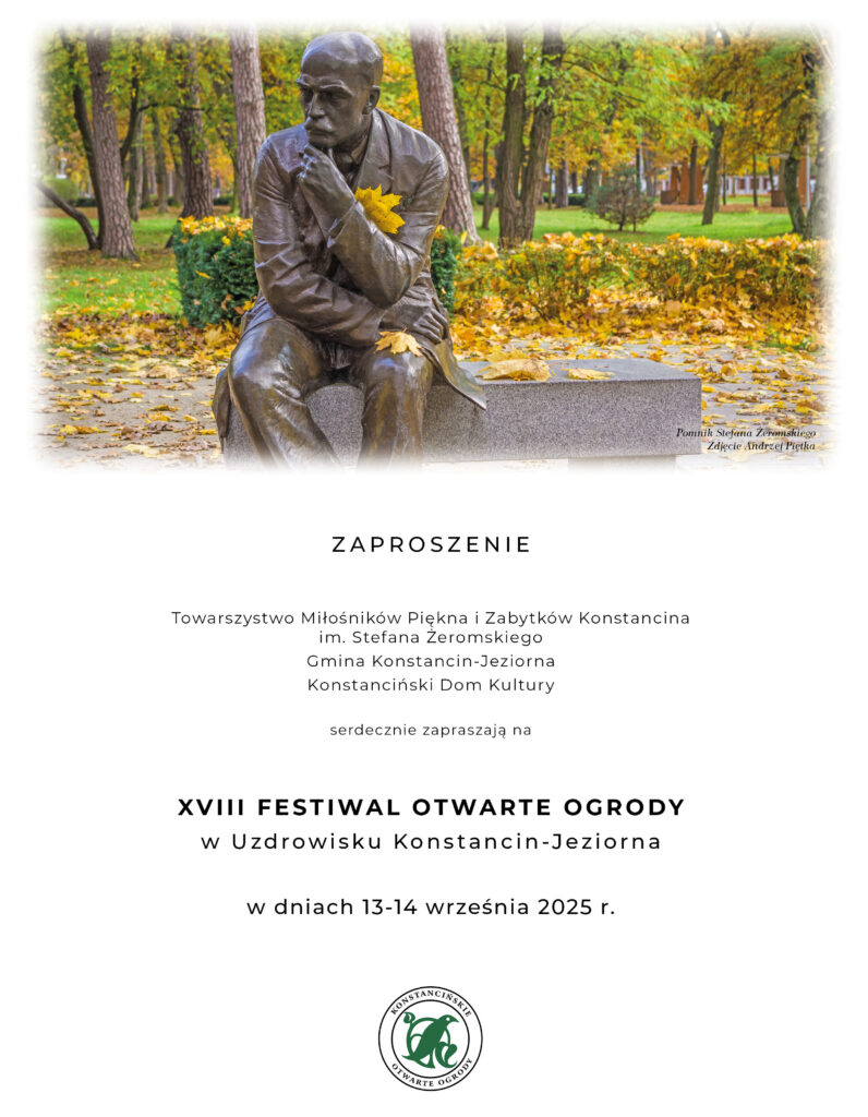 Towarzystwo Miłośników Piękna i Zabytków Konstancina im. Stefana Żeromskiego już po raz 18-ty zaprasza na Festiwal Otwarte Ogrody w dniach 13 i 14 września 2025 r przygotowanez Konstancińskim Domem Kultury Hugonówka. Rok 2025 to Rok Stefana Żeromskiego uchwalony decyzją Sejmu Rzeczpospolitej Polskiej. Towarzystwo było inicjatorem wniosku odnośnie tej Uchwały. Z tej okazji przez cały rok w Konstancinie odbywają się uroczystości poświęcone pisarzowi. W ogrodzie willi Świt, domu Stefana Żeromskiego w sobotę, 13 września 2025 r. odbędzie się uroczysta Inauguracja XVIII Festiwalu Otwartych Ogrodów. Przygotowaliśmy wiele atrakcji: wystawę pamiątek po pisarzu i jego rodzinie, żonie Annie Zawadzkiej i córce Monice, wydania dzieł z ilustracjami malarza Krzysztofa Henisza, medale wybite z okazji rocznic związanych ze Stefanem Żeromskim, pocztówki namalowane przez córkę pisarza Monikę, drzewo genealogiczne rodziny Żeromskich, wystawę Stefan Żeromski w Rapperswilu. Niewątpliwą atrakcją będzie nieczęsta możliwość zwiedzania domu pisarza. Z okazji Roku Żeromskiego wydajemy II wydanie naszego mini przewodnika Spacerem po Konstancinie-Jeziornie. Znajdą się w nim trasy spacerów Stefana Żeromskiego i jego córki Moniki. Nie ustajemy w staraniach o utworzenie w willi Świt Muzeum Rodziny Żeromskich.